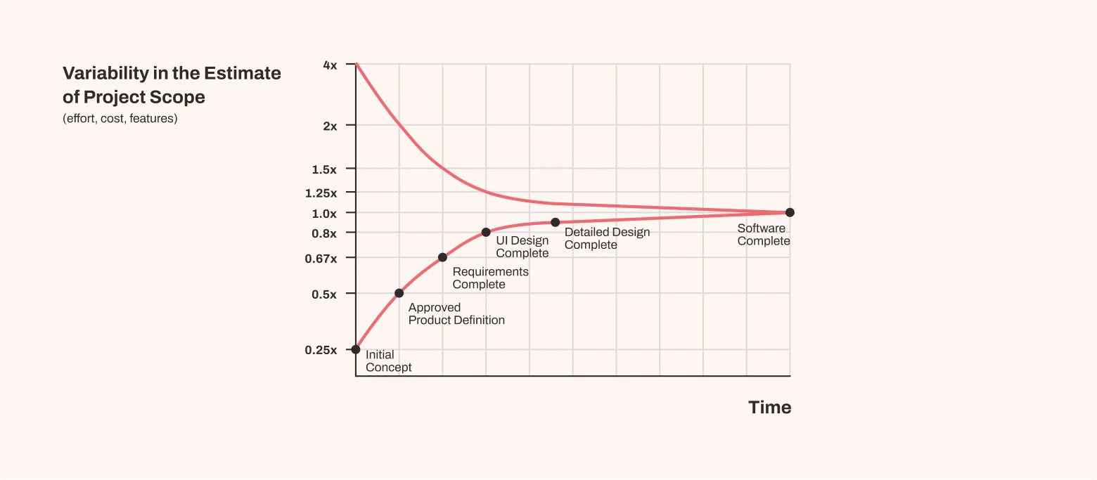 This is the cone of uncertainty: wide at the beginning, narrowing as clarity grows. Treat early estimates as ranges, not fixed numbers. Later estimates are more precise, but by then, flexibility is limited.