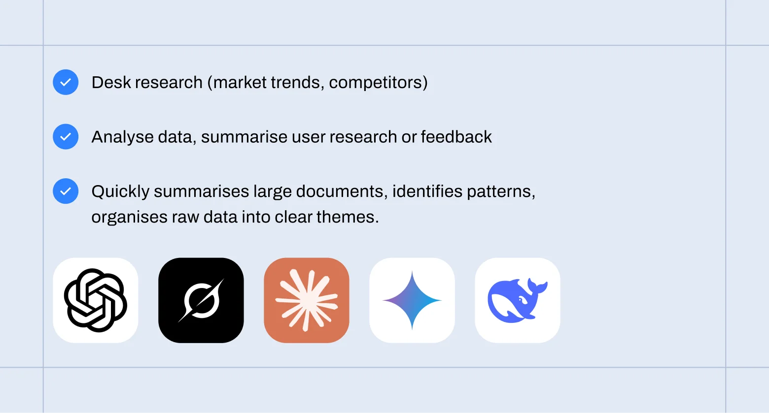 Tools like ChatGPT, Claude, and Gemini help us get familiar with a new domain and summarize market trends quickly. They assist us in surfacing early user pain points and make our so-called desk research way faster.